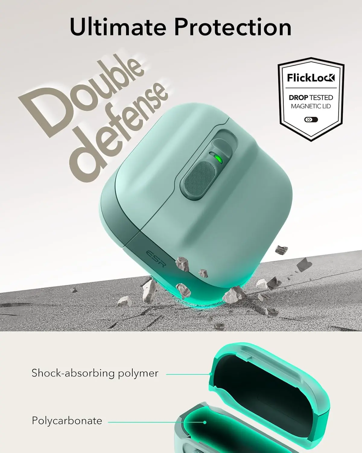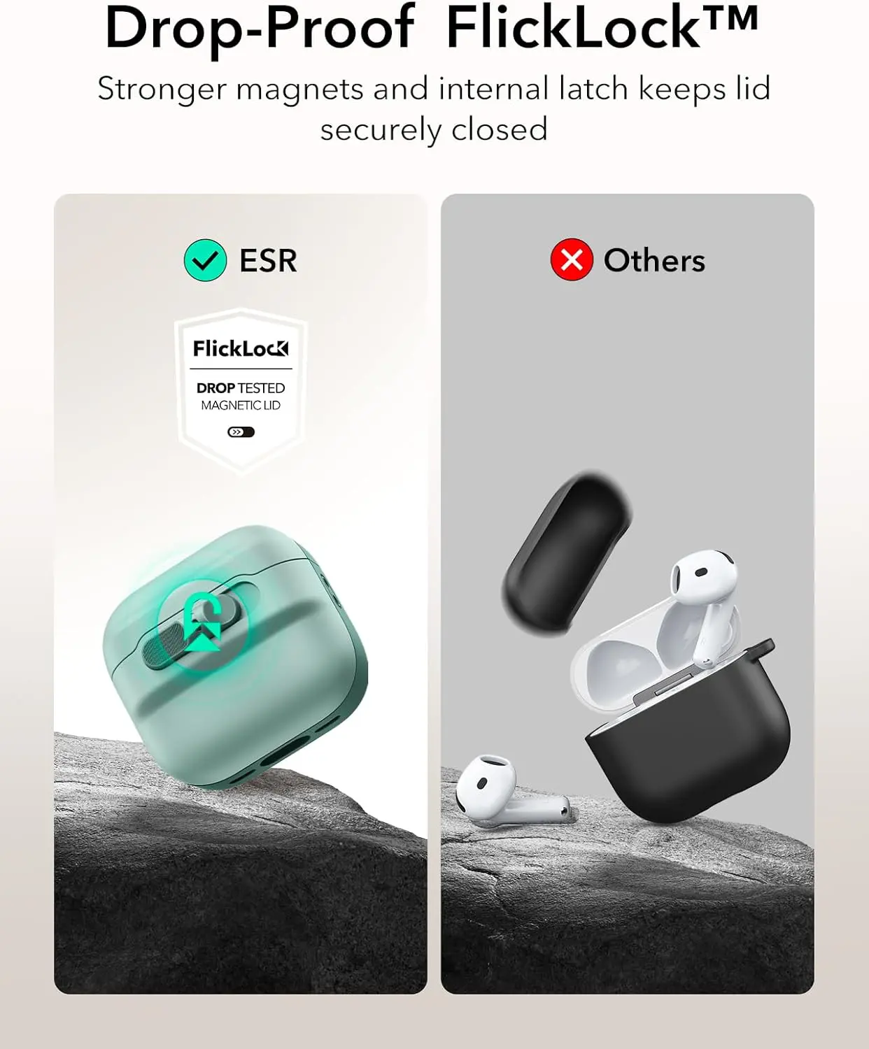 - FlickLock sécurisé : de puissants aimants d’une force d’adhérence de 700 g en haut et en bas du couvercle et une fermeture interne maintiennent tes AirPods en toute sécurité à l’intérieur, afin qu’ils ne puissent pas s’échapper en cas de chute.